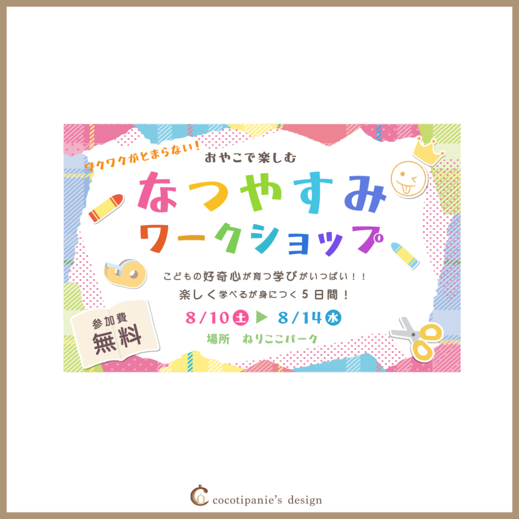 親子で楽しめる体験ができるようなポップで明るいイメージで配色しました。