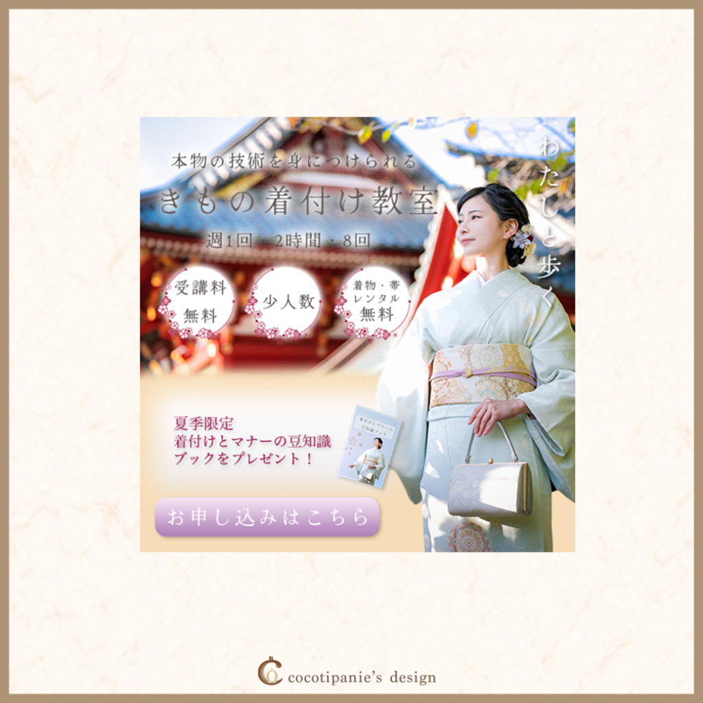 「着付け教室で習い、着物を着てお出かけしたくなるような成果を得られる」をコンセプトに写真選びをしました。